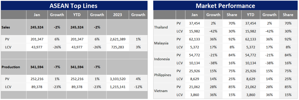 ASEAN Light Vehicle (LV) sales experienced a marginal 2% YoY decrease in January 2024 (January), with mixed results across the region. Indonesia and Thailand encountered significant declines, whereas Malaysia, Vietnam, and the Philippines saw robust growth.